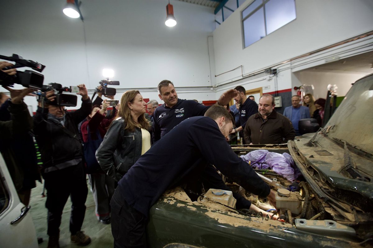 La consejera de Desarrollo Educativo y Formación Profesional, María del Carmen Castillo (c) junto a los coches afectados por la Dana de Valencia y que están reparando alumnos de IES La Campiña. A 03 de febrero de 2025, en Arahal (Andalucía, España). - Esther Lobato - Europa Press