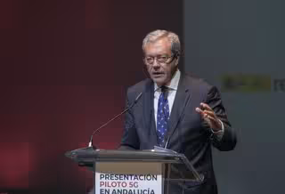 El consejero de Economía de la Junta de Andalucía, Rogelio Velasco, durante su intervención en la presentación del proyecto Piloto 5G en Andalucía. En el Vodafone 5G Smart Center. Sevilla, a 28 de noviembre de 2019. - María José López - Europa Press