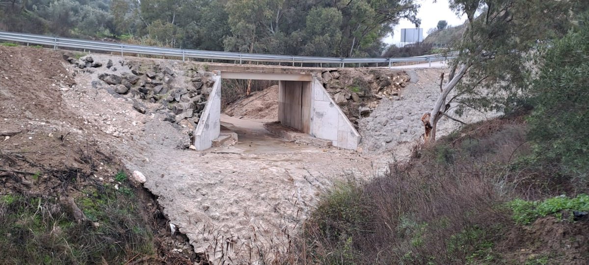 El agua recogida por la cuneta revestida de la margen izquierda y las aguas de escorrentía aportadas por el drenaje del camino localizado en el kilómetro 47,6 provocaron "cárcavas importantes en la cuneta". Las obras de emergencia han consistido en la demolición de las aletas aguas abajo y el saneo de las zonas erosionadas por el agua de escorrentía. Además, se ha procedido a la protección de cauce y taludes aguas abajo para construir una nueva losa de cimentación y aletas ancladas a la estructura existente.