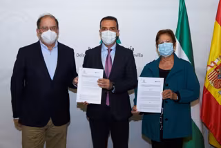 Al acto de la firma han asistido el presidente de Madre Coraje, José Jiménez, así como la delegada de la ONG en Sevilla, Asunción Cabedo y la gerente de la misma en la provincia, María José Herrerra, según ha detallado la Junta en un comunicado.
