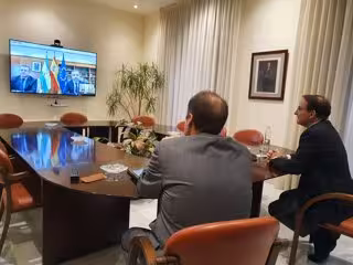 Imagen de la videoconferencia entre el consejero de Hacienda, Juan Bravo, y el presidente de Garántia, Javier González de Lara, para la firma del convenio. - GARÁNTIA