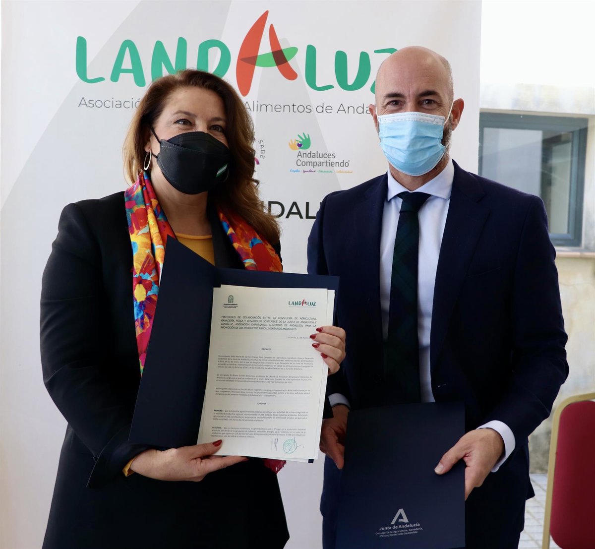 La consejera de Agricultura, Ganadería, Pesca y Desarrollo Sostenible, Carmen Crespo y el presidente de la Asociación Empresarial Alimentos de Andalucía (Landaluz), Álvaro Guillén, han suscrito un protocolo marco de colaboración para la promoción de los productos agroalimentarios andaluces que, con una vigencia inicial de cuatro años, va a permitir afianzar la apuesta conjunta por subrayar la calidad de los productos de la comunidad.