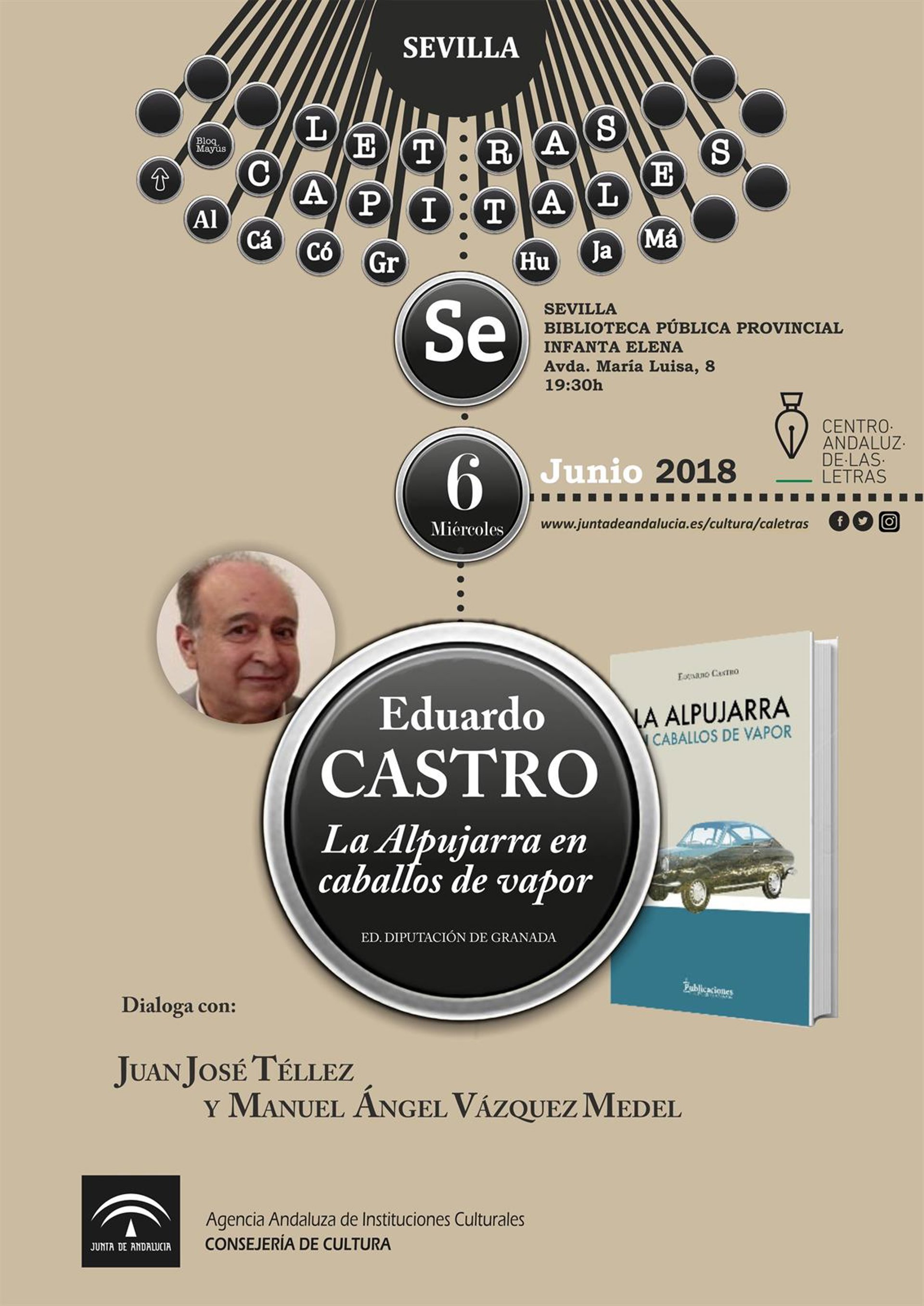 La Consejería de Cultura, a través del Centro Andaluz de las Letras (CAL), arranca la programación del ciclo 'Letras Capitales' en junio con la presentación del libro del escritor y periodista Eduardo Castro 'La Alpujarra en caballos a vapor', publicado por la Diputación de Granada. El encuentro, que se celebrará este miércoles día 6 en la biblioteca Infanta Elena a las 19,30 horas, contará con la participación del director del CAL, Juan José Téllez, y el catedrático Manuel Ángel Vázquez Medel.