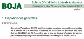 El Boletín Oficial de la Junta de Andalucía (BOJA) ha publicado poco antes de las 23 horas de este jueves una edición extraordinaria con un decreto del presidente, Juanma Moreno, sobre medidas en aplicación del estado de alarma para contener la propagación de infecciones causadas por el SARS-COV-2 que regula el cierre perimetral de la comunidad y el confinamiento de más de 4,5 millones de habitantes de 449 municipios de las provincias de Cádiz, Córdoba, Granada, Jaén, Málaga y Sevilla desde las 00.00 horas de este viernes y hasta el próximo 9 de noviembre.