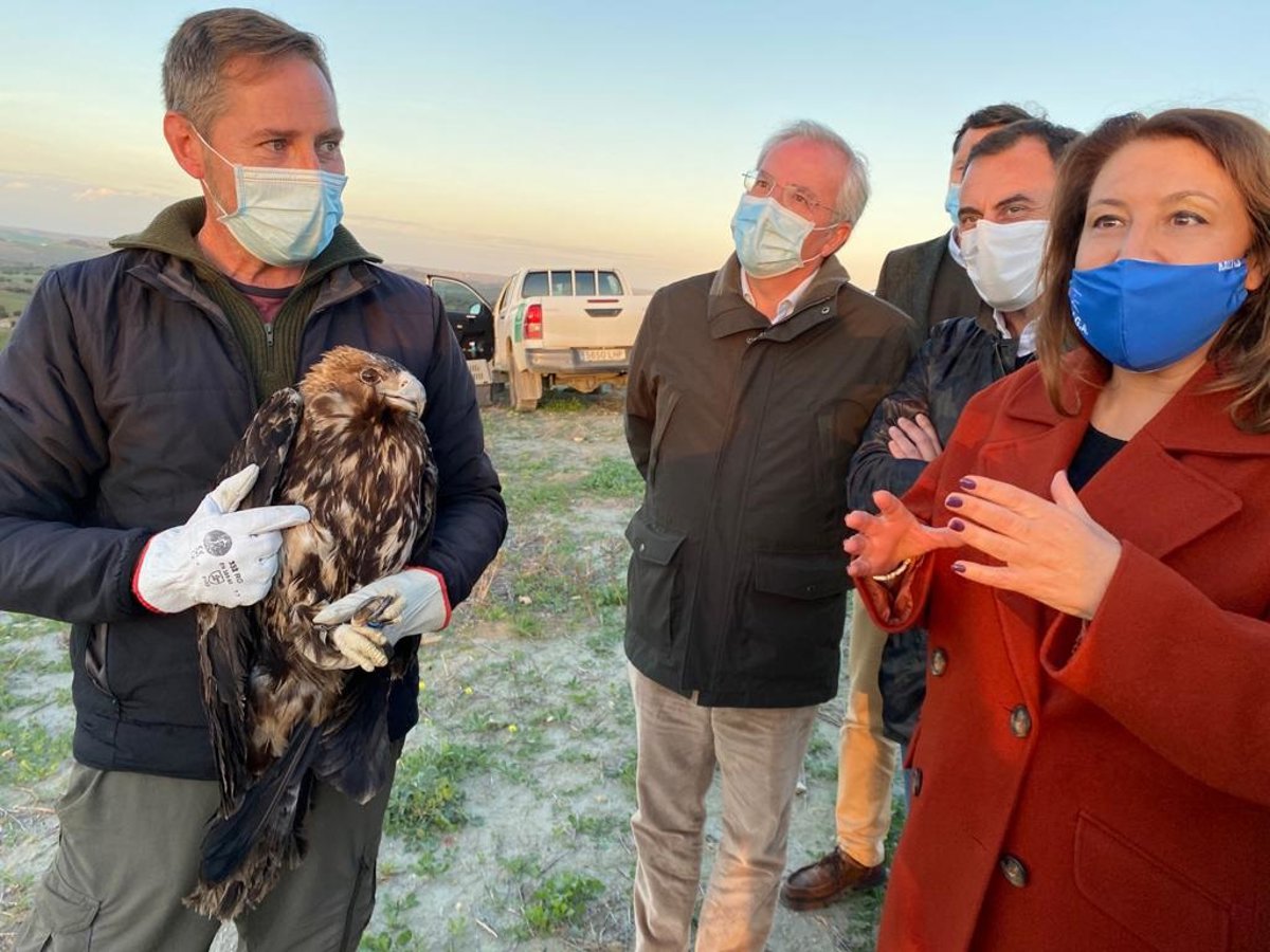 Crespo ha participado este martes en la suelta de un ejemplar de águila imperial encontrado con diversas lesiones pero que, tras su paso por el Centro de Recuperación de Especies Amenazadas (CREA) de San Jerónimo (Sevilla), se encuentra actualmente en condiciones para volver al hábitat natural del término municipal de Utrera, donde se encontraba asentado antes del incidente.