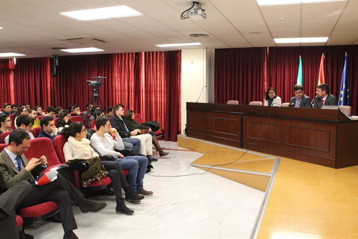 El secretario general de Innovación, Vicente Fernández; la directora del Territorio Sur de Telefónica, María Jesús Almazor, y el vicerrector de Transferencia Tecnológica, Ramón González Carvajal, han sido los encargados de dar a conocer a los estudiantes del funcionamiento de este programa.