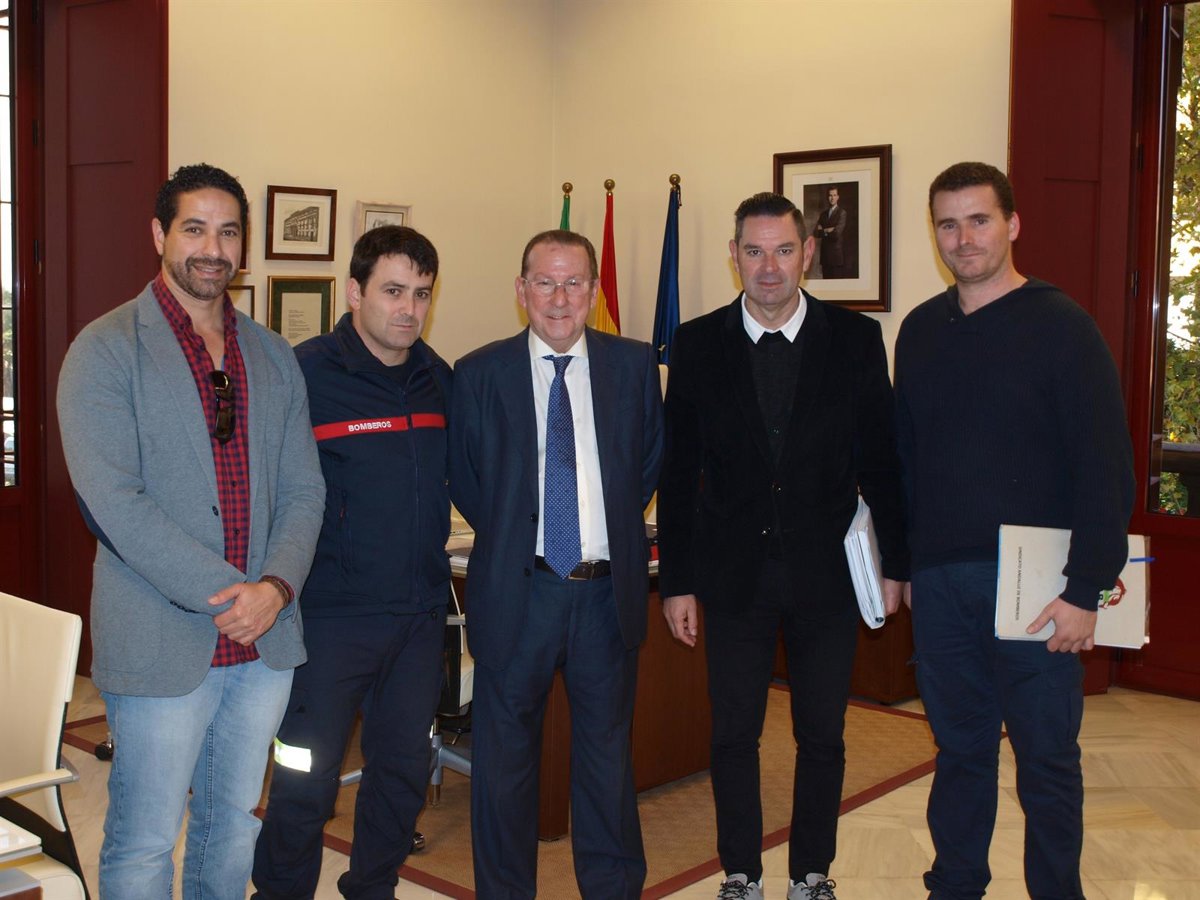 El consejero de Justicia e Interior, Emilio de Llera, acompañado del director general de Interior, Emergencias y Protección Civil, Demetrio Pérez, se ha reunido este lunes con el secretario general del Sindicato Andaluz de Bomberos (SAB), Miguel Sánchez, y otros miembros de la organización.
