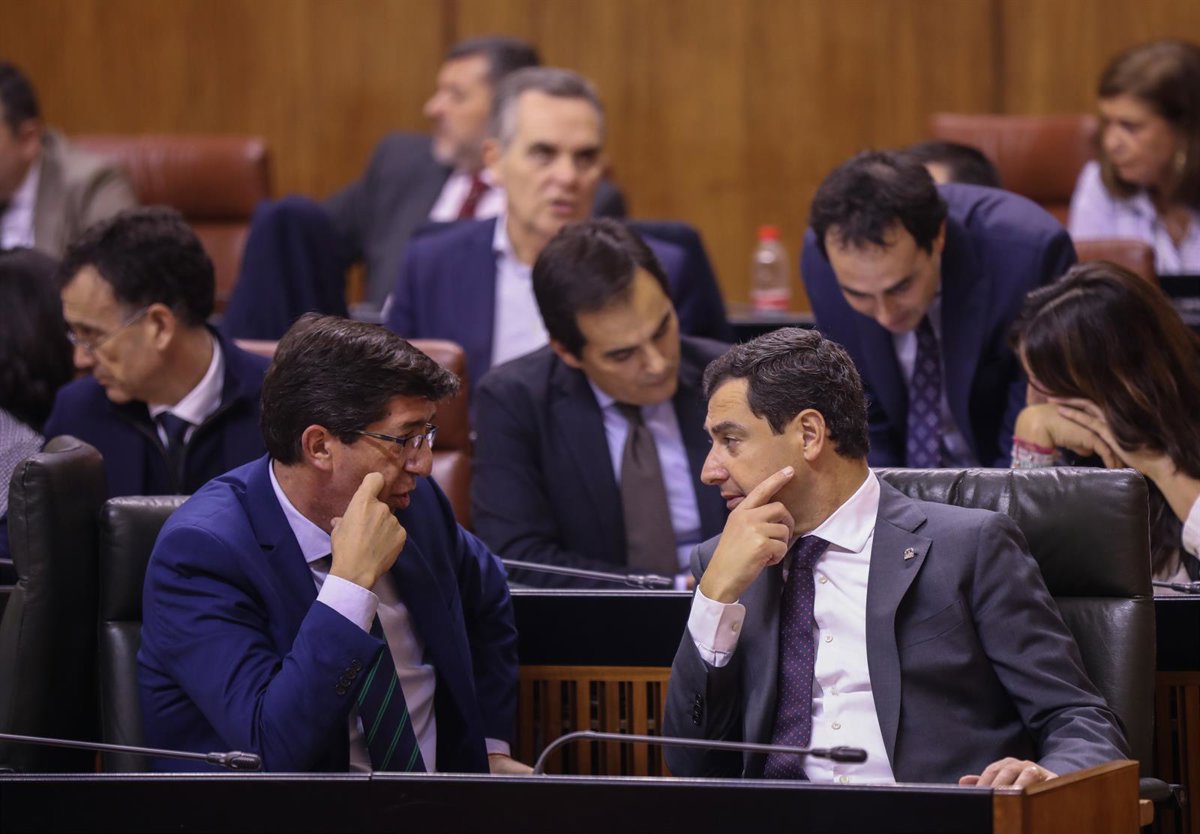 El presidente de la Junta de Andalucía, Juanma Moreno (d), conversa con el vicepresidente de la Junta de Andalucía, Juan Marín (i) durante la primera jornada de sesión plenaria. En el Parlamento de Andalucía, (Sevilla), a 27 de noviembre de 2019. - María José López - Europa Press