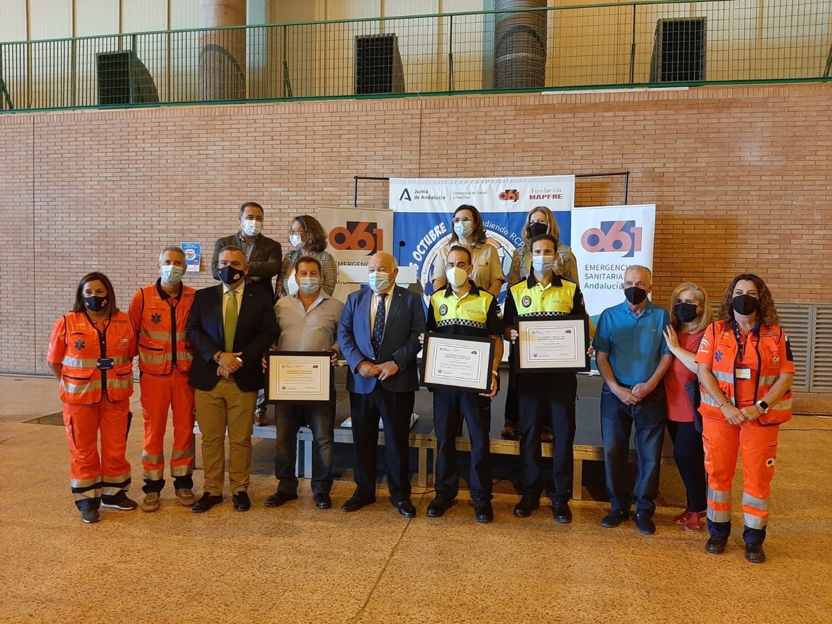 Acompañado por la delegada de Salud y Familias, Regina Serrano, por la delegada de Educación y Deportes, María José Eslava, por el director gerente de EPES 061, Fernando Ayuso, por la directora del Plan Andaluz de Urgencias y Emergencias (PAUE), Carmen Navarro y por el director del 061 de Sevilla, José María Villadiego, Aguirre ha hecho entrega de un reconocimiento especial a tres personas que actuaron como primeros