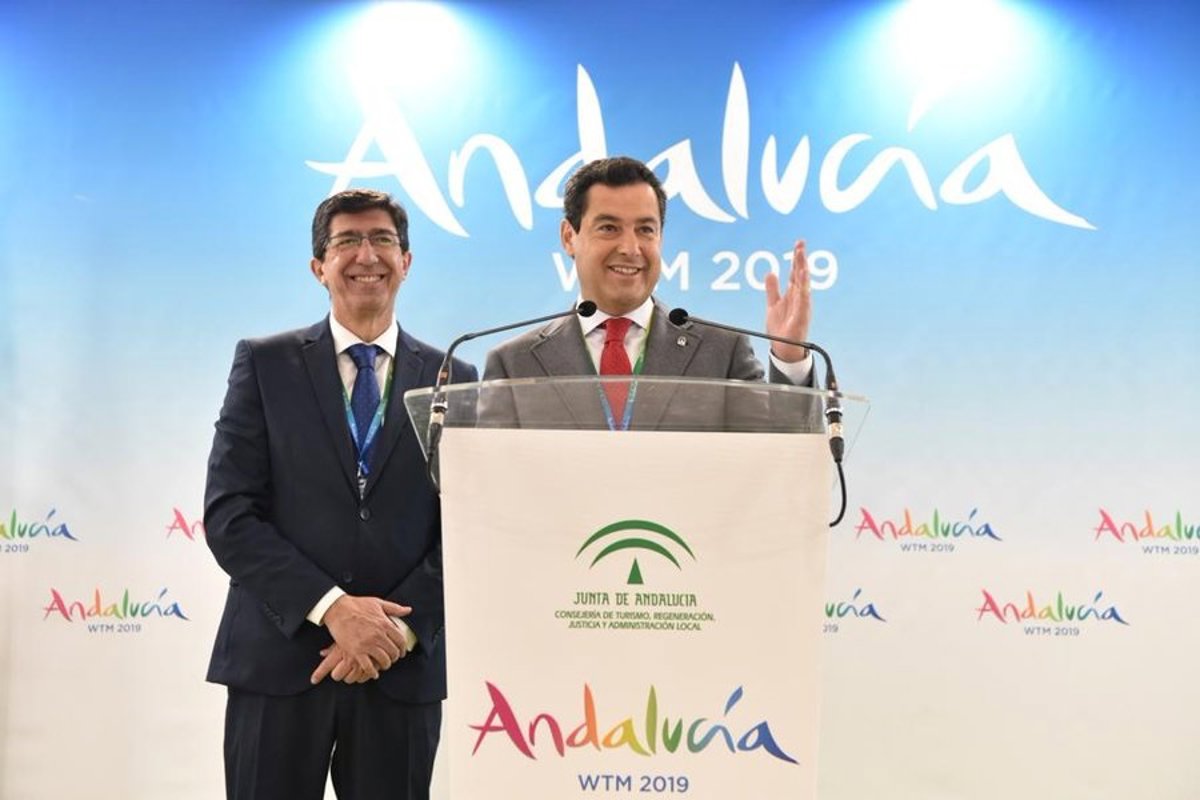 El presidente de la Junta de Andalucía, Juanma Moreno, en Londres, en la World Travel Market, ante Juan Marín - JUNTA