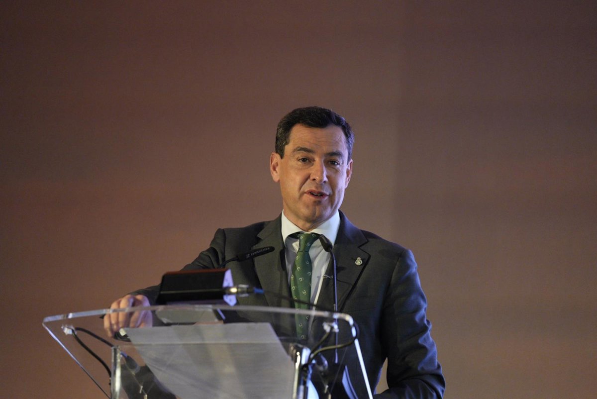 El presidente de la Junta de Andalucía, Juanma Moreno, durante su intervención en las II Jornadas de Incendios Forestales y Riesgos Naturales organizada por la Fundación Felipe González y la Revista RlyRN - JOAQUÍN CORCHERO / EUROPA PRESS