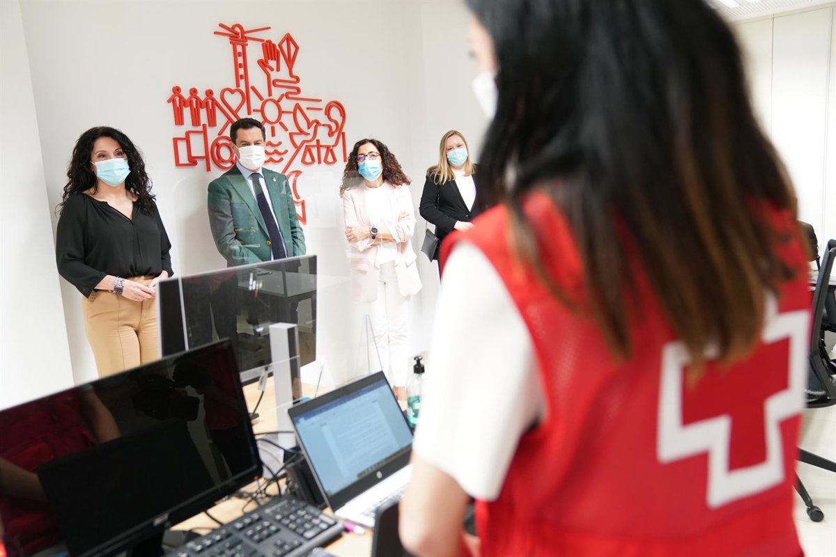 Moreno ha estado acompañado por la consejera de Igualdad, Políticas Sociales y Conciliación, Rocío Ruiz; por la presidenta de Cruz Roja Española en Andalucía, María del Mar Pageo, y la presidenta de la Confederación andaluza de empresarios de alimentación y perfumería, Virginia González.