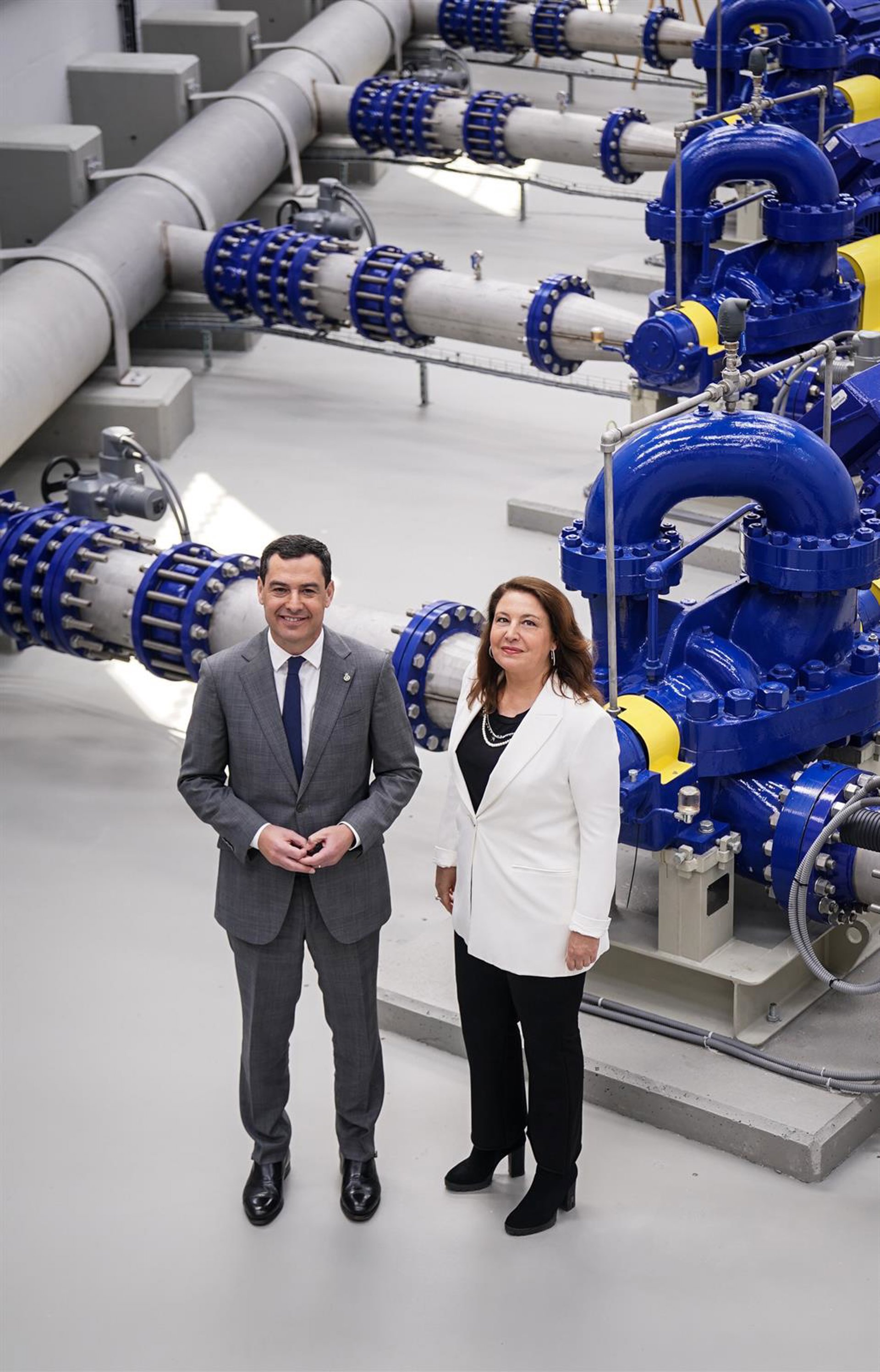 El presidente de la Junta, Juanma Moreno, y la consejera de Agricultura, Pesca, Agua y Desarrollo Rural, Carmen Crespo, en la inauguración de la estación de bombeo de agua 'OsunaI'. - JUNTA DE ANDALUCÍA