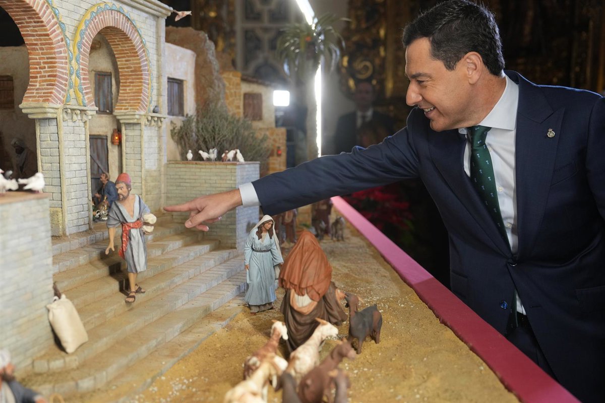 El presidente de la Junta, Juanma Moreno, ha inaugurado este miércoles el Belén del Palacio de San Telmo, en Sevilla, y ha agradecido la colaboración de la Asociación Belenista de Málaga 'La Alcazaba', una entidad presidida por Bernardo Herrera y que en 2024 cumple diez años de pasión, oficio y de artesanía.