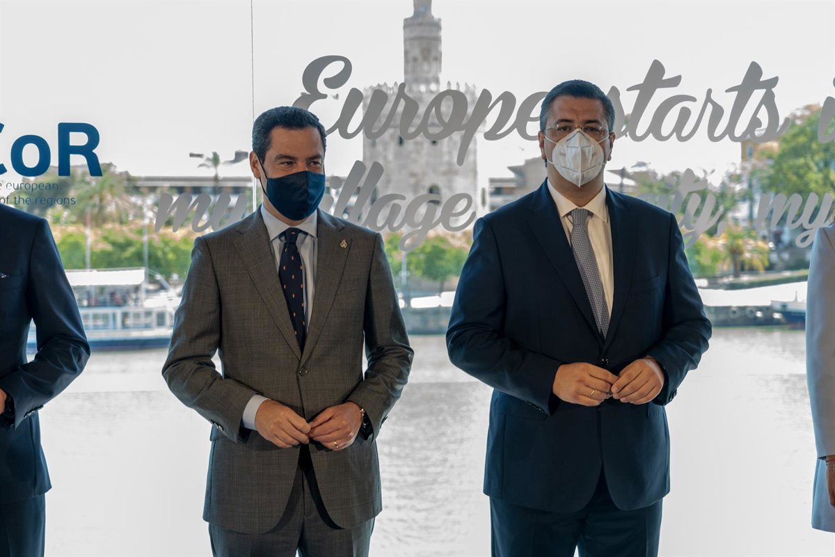 Archivo - El presidente de la Junta y del PP-A, Juanma Moreno (1), y el presidente del Comité de las Regiones, Apostolos Tzitzikostas (d), posan antes de inaugurar una jornada del PP Europeo sobre la Ley Europea del Clima a 23 de junio del 2021 en Sevi - Eduardo Briones - Europa Press - Archivo