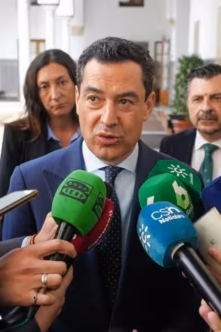 El presidente de la Junta de Andalucía, Juanma Moreno, atiende a los medios a su llegada a la sesión de control. A 07 de marzo de 2024, en Sevilla (Andalucía, España). Segunda jornada de Pleno con la Sesión de Control al Gobierno con preguntas de los grup - Francisco J. Olmo - Europa Press