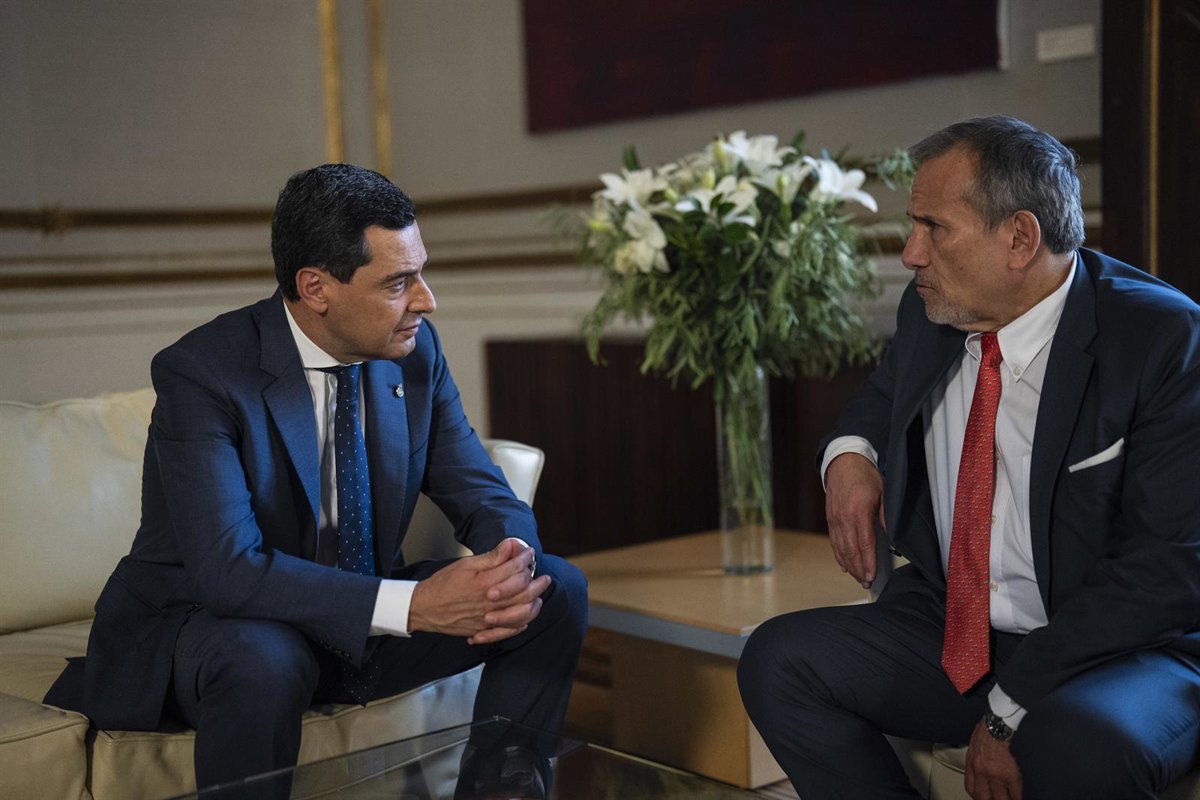 El presidente de la Junta de Andalucía, Juanma Moreno, y el canciller de Perú, Elmer Schialer, este martes reunidos en el Palacio de San Telmo en Sevilla. - JUNTA DE ANDALUCÍA