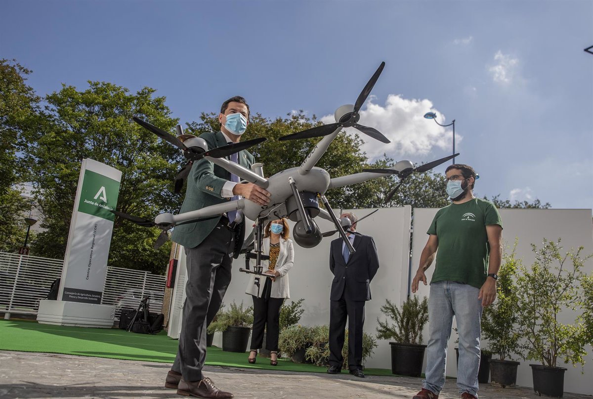 La visita del presidente de la Junta a la nueva sede del Infoca ha contado con la presencia de la consejera de Agricultura, Ganadería, Pesca y Desarrollo Sostenible, Carmen Crespo.