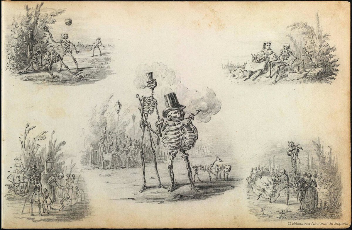 El segundo de los dibujos trazados en una hoja suelta tiene una naturaleza muy distinta, dado que es una creación satírica y grotesca protagonizada por uno de los temas más recurrentes en la obra gráfica del autor de 'Rimas y Leyendas': los esqueletos.