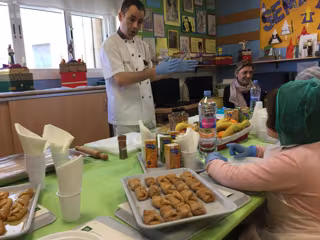 Abraham Romero, uno de los jefes de cocina de la Unidad de Hostelería del Hospital Virgen Macarena de Sevilla, ha organizado para los niños hospitalizados un pequeño taller de cocina en el aula escolar, con la finalidad de enseñar como se elaboran los pestiños, un tradicional dulce de Semana Santa.