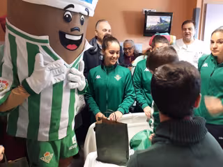 El carismático Rafael Gordillo ha esto acompañado de la consejera bética María Victoria López. Además, se han desplazado hasta el hospital deportistas de la entidad verdiblanca en diversos ámbitos: equipo de fútbol femenino, equipo de fútbol sala y equipo de baloncesto. A la cita también se ha sumado la mascota bética, Palmerín.