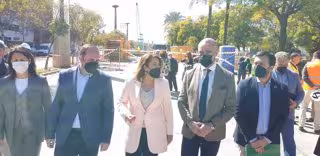 La consejera de Agricultura, Ganadería, Pesca y Desarrollo Sostenible, Carmen Crespo (tercera por la derecha), y el alcalde de Sevilla, Antonio Muñoz (segundo por la derecha), en la visita realizada a las obras en la avenida Alberto Jiménez Becerril. - AYUNTAMIENTO DE SEVILLA