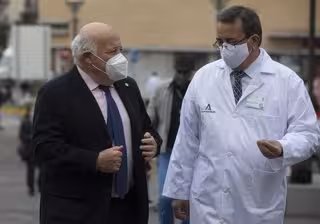 El consejero de Salud y Familias, Jesús Aguirre (i), conversa con el director gerente del hospital, Manuel Molina, durante la visita a las nuevas instalaciones del Hospital Infantil Virgen del Rocío. En Sevilla (Andalucía, España), a 27 de enero de 2021. - María José López - Europa Press