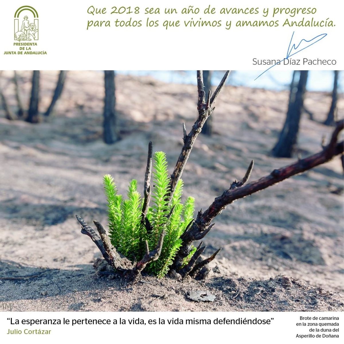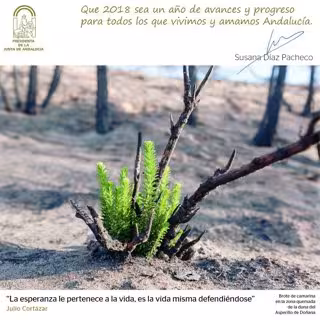 La presidenta de la Junta de Andalucía, Susana Díaz, felicita con la imagen de un brote verde en la zona afectada por el incendio registrado el pasado verano en Moguer (Huelva), en el entorno del Parque Nacional de Doñana, y una cita del escritor argentino Julio Cortázar.