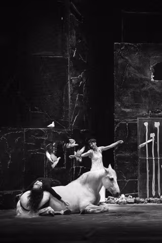 La obra muestra un escenario donde predominan el blanco y el negro, "los intersticios de un mundo en ruinas y los personajes de una civilización en búsqueda de otro espacio". Así, la representación adquiere connotaciones corales y el movimiento aparece motivado por la idea del rito y el trance. "Las paredes siguen dejando sus signos en los cuerpos y vuelven a ser maleables; animales y humanos se mueven, en vertical y horizontal, con total libertad por el espacio".