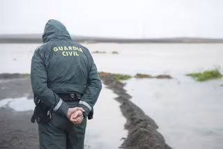 Un Guardia Civil en el lugar del desbordamiento en el Palmar de Troya la situación en el terreno tras el paso de las borrascas, a 7 de febrero de 2026 en Sevilla (Andalucía, España). - Joaquín Corchero - Europa Press