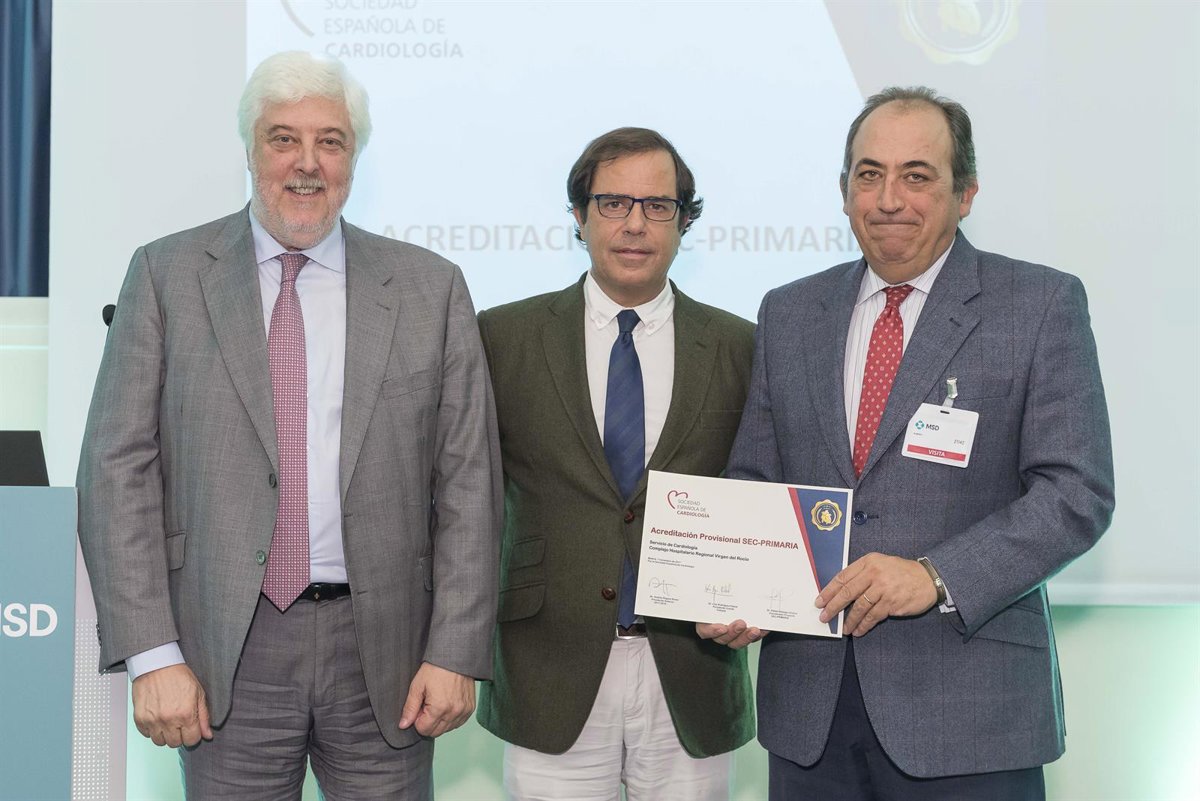 El presidente saliente de la SEC, Andrés Íñiguez, y el coordinador de Sec-Primaria, Rafael Hidalgo, han sido los responsables de entregar las acreditaciones de la Sociedad Española de Cardiología. Por parte del Hospital Universitario Virgen del Rocío, la acreditación fue recogida por el cardiólogo Gonzalo Barón en nombre de todos los profesionales de la Unidad de Cardiología, dirigida por Ernesto Lage.
