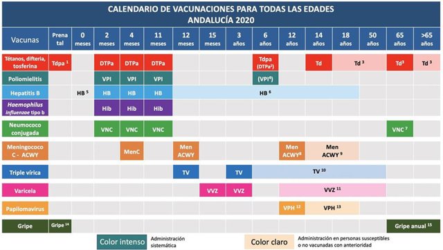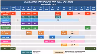 El calendario de vacunaciones recomendado por la Consejería de Salud y Familias de la Junta de Andalucía para su aplicación a partir del 1 de enero de 2020 ofrece protección frente a 14 enfermedades. Entre las novedades principales de este año es la inclusión de información vacunal referente a todas las franjas de edad, incluido las embarazadas, y la aplicación, por primera vez en la comunidad autonóma, de la vacuna meningocócica tetravalente para los 12 meses y 12 años.