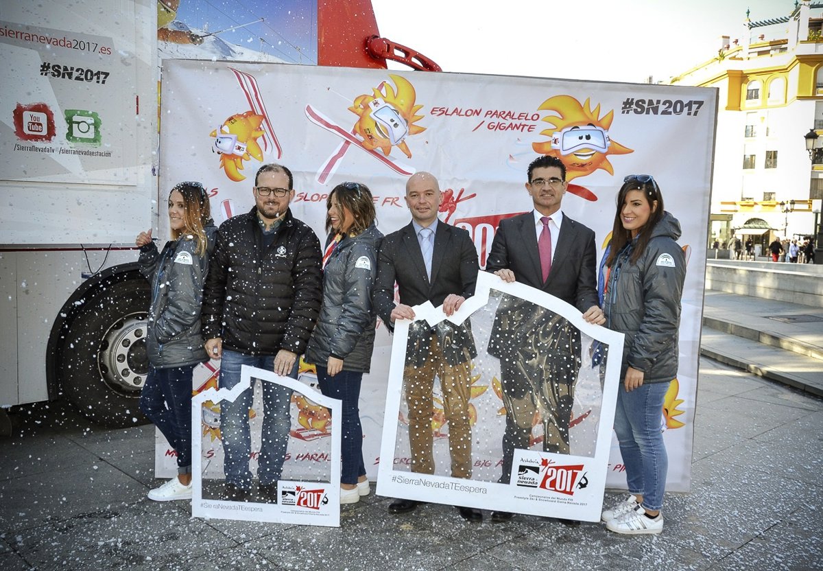 La estación de esquí y montaña de Sierra Nevada presenta en Sevilla la temporada de invierno en el marco de una gira promocional con un bus interactivo que está recorriendo los centros históricos de las capitales andaluzas, ofreciendo información sobre las novedades de esta nueva temporada y la celebración del Campeonato del Mundo FIS de Snowboard y Freestyle.