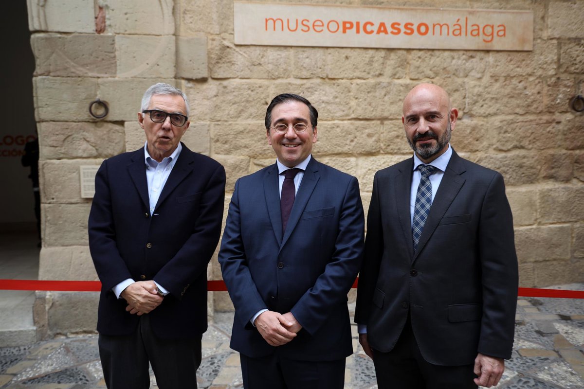 El ministro de Asuntos Exteriores, Unión Europea y Cooperación, José Manuel Albares posa en la entrada del Museo Picasso Málaga, acompañado por el subdelegado del Gobierno, Javier Salas (i) y el candidato a la alcaldía de Málaga, Daniel Pérez a 9 de mar - Álex Zea - Europa Press