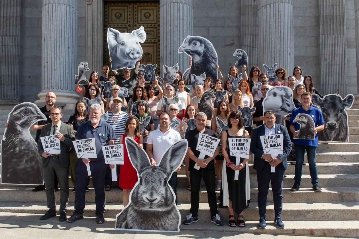 La coalición 'End The Cage Age', representada en por las organizaciones Anima Naturalis, Compassion in World Farming, Intercids, Igualdad Animal y el Observatorio de Bienestar Animal, se ha concetrado este miércoles frente al Congreso de los Diputados para exigir el fin del uso de jaulas en la ganadería en la Unión Europea.