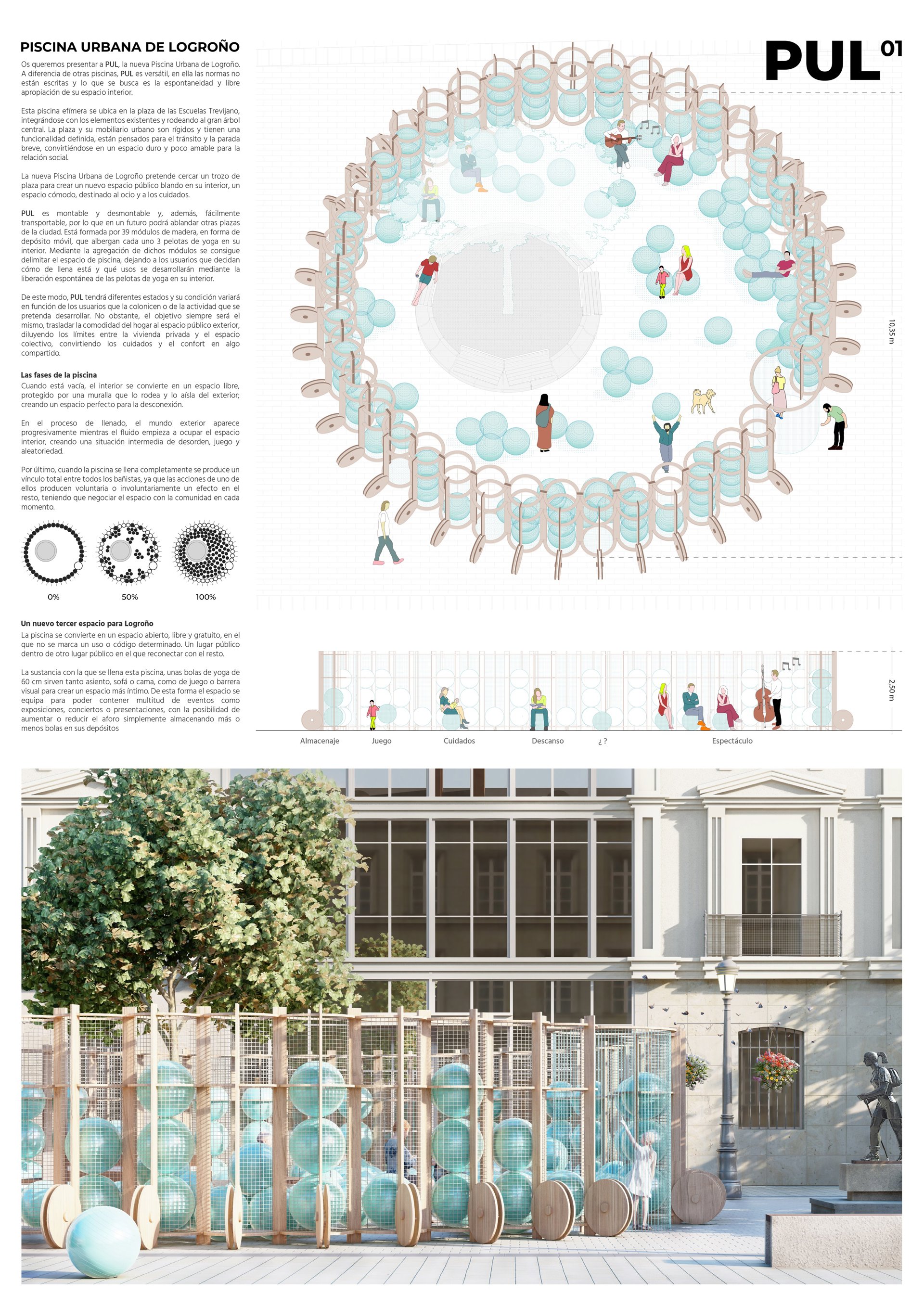 meii estudio (Elvira Carrión, Jose M Mateo), Clara Torregrosa, Gabriel Millán / España. A diferencia de otras piscinas, PUL es versátil, en ella las normas no están escritas y lo que se busca es la espontaneidad y libre apropiación de su espacio interior. Esta piscina efímera se ubicará en la Plaza de las Escuelas Trevijano, integrándose con los elementos existentes y rodeando al gran árbol central.