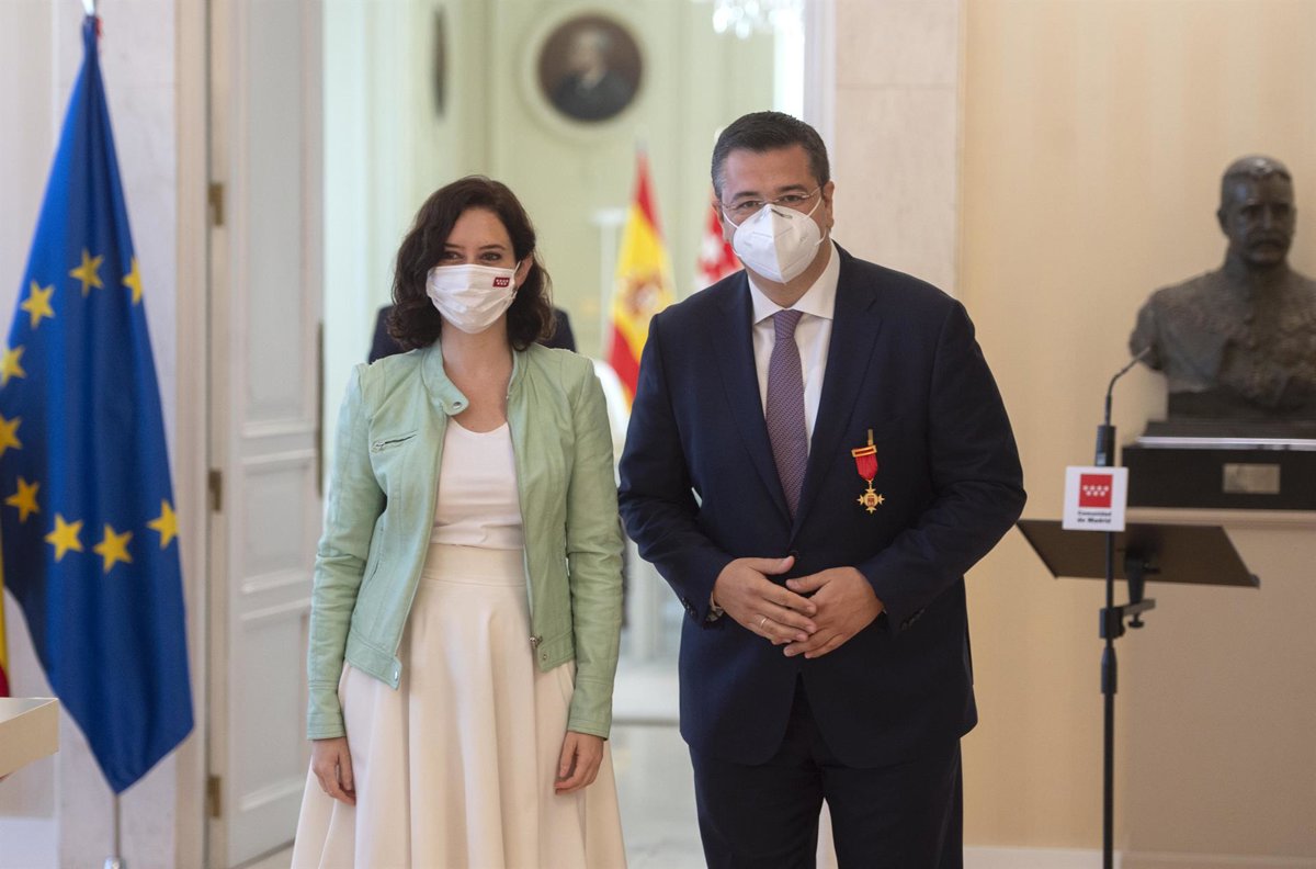 La presidenta de la Comunidad de Madrid, Isabel Díaz Ayuso, ha entregado este jueves la Medalla Internacional de la Comunidad al presidente del Comité Europeo de las Regiones (CdR), Apostolos Tzitzikostas, en reconocimiento a su "entrega y apoyo blindado" a la región.