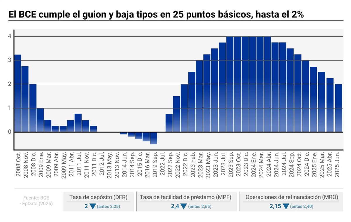El BCE cumple el guion y baja tipos en 25 puntos básicos, hasta el 2% - EPDATA