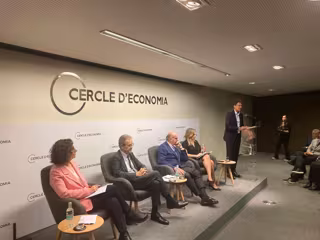 El vicepresidente del BCE, Luis de Guindos; el economista Jordi Gual; el presidente del Cercle d'Economia, Jaume Guardiola, y las periodistas Amanda Mars y Elisenda Vallejo. - EUROPA PRESS