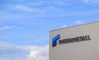Archivo - FILED - 27 August 2025, Lower Saxony, Unterluess: A logo hangs on Rheinmetall's new artillery plant. Photo: Julian Stratenschulte/dpa - Julian Stratenschulte/dpa - Archivo