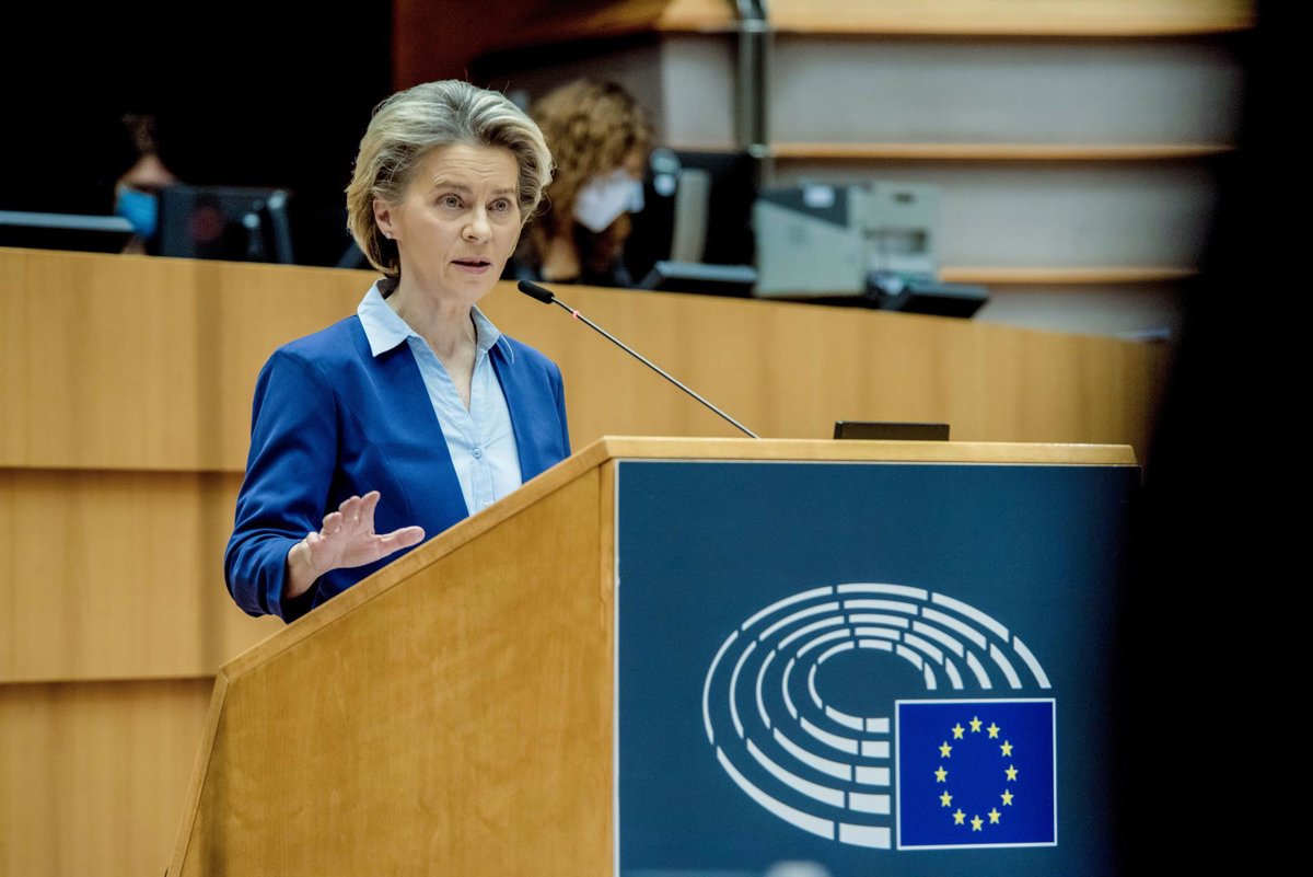 HANDOUT - 10 February 2021, Belgium, Brussels: European Commission President Ursula von der Leyen speaks during a plenary debate on the united EU approach to coronavirus (COVID-19) vaccinations at the European Parliament. Photo: Etienne Ansotte/European - Etienne Ansotte/European Commiss / DPA