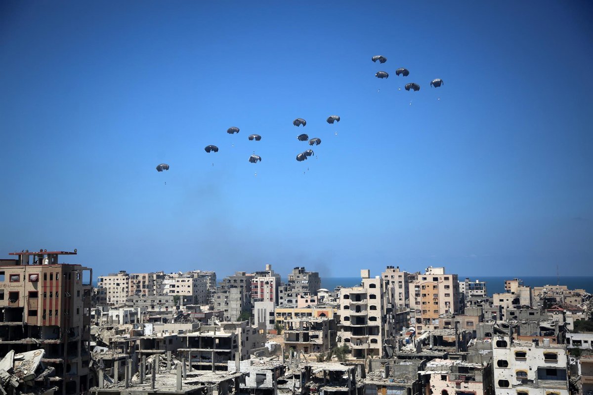 06 August 2025, Palestinian Territories, Gaza: A German military aircraft loaded with humanitarian aid drops supplies over Gaza, as seen from the northern Gaza Strip. Photo: Omar Ashtawy/APA Images via ZUMA Press Wire/dpa - Omar Ashtawy/APA Images via ZUMA / DPA