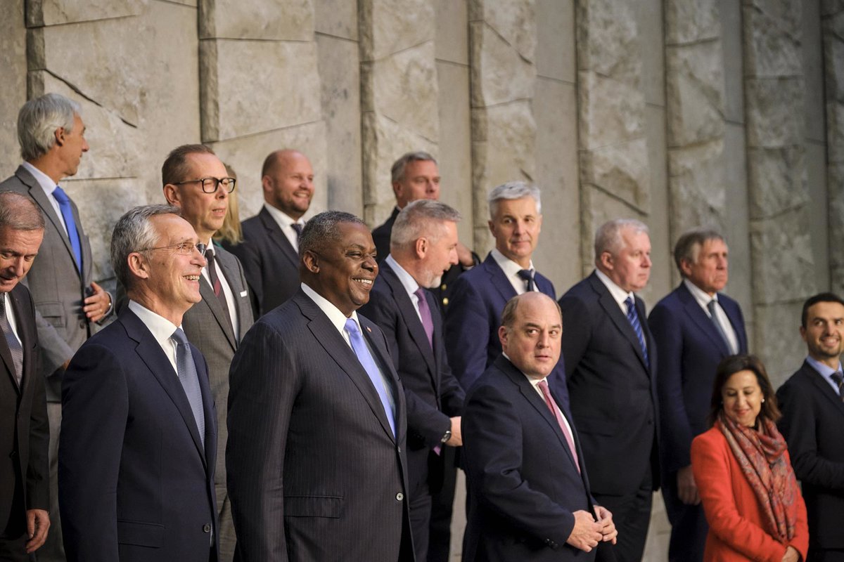 21 October 2021, Belgium, Brussels: (Front, L-R) NATO Secretary General Jens Stoltenberg, Lloyd J. Austin III, US Secretary of Defence, Ben Wallace, UK Secretary of State for Defence and Margarita Robles, Minister of Defence of Spain pose for a group pi - F.Garrido-Ramirez/NATO/dpa