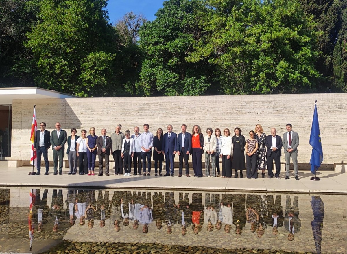 El alcalde de Barcelona, Jaume Collboni, junto a los miembros de el nuevo grupo de expertos 'Europa Pròxima' en el pabellón Mies Van der Rohe.