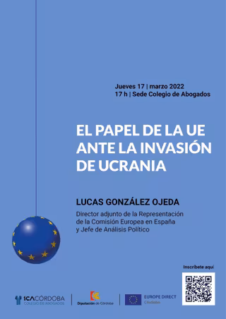 Cartel anunciador de la sesión informativa organizada por la Diputación de Córdoba y el Colegio de Abogados sobre el papel de la UE ante la invasión de Ucrania. - DIPUTACION DE CORDOBA