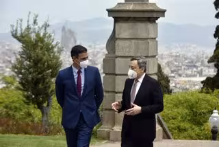 Archivo - El presidente del Gobierno, Pedro Sánchez (i), y el primer ministro italiano, Mario Draghi (d), llegan al Palacio Albéniz, para participar en un encuentro bilateral, a 18 de junio de 2021, en Barcelona, Catalunya (España). Sánchez y Draghi alm - David Oller - Europa Press - Archivo