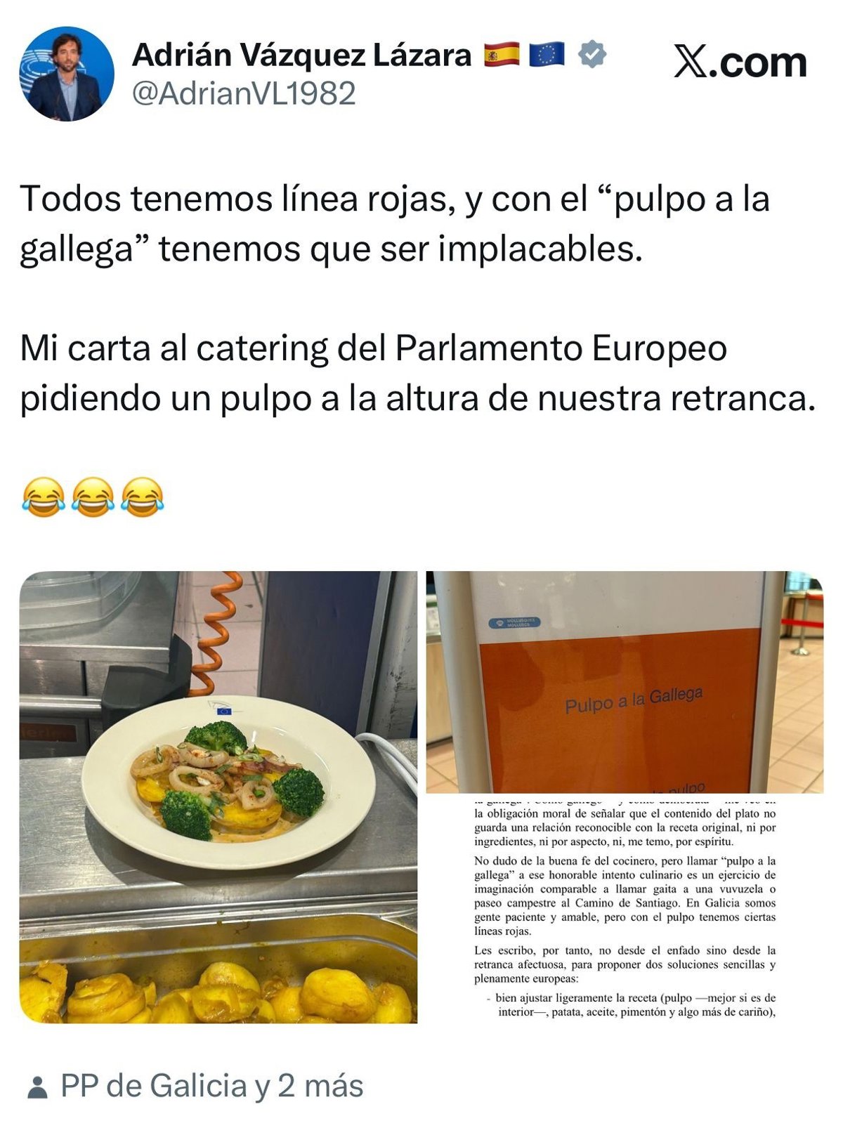 En el mismo comentario, aporta su carta al catering del Parlamento Europeo pidiendo "un pulpo" a la altura "de la retranca" gallega. En ella, tras agradecer "el esfuerzo diario por alimentar a la honorable institución, tarea nada sencilla dada su diversidad", Vázquez confiesa su "sorpresa" ante la preparación del 'pulpo a la gallega'.