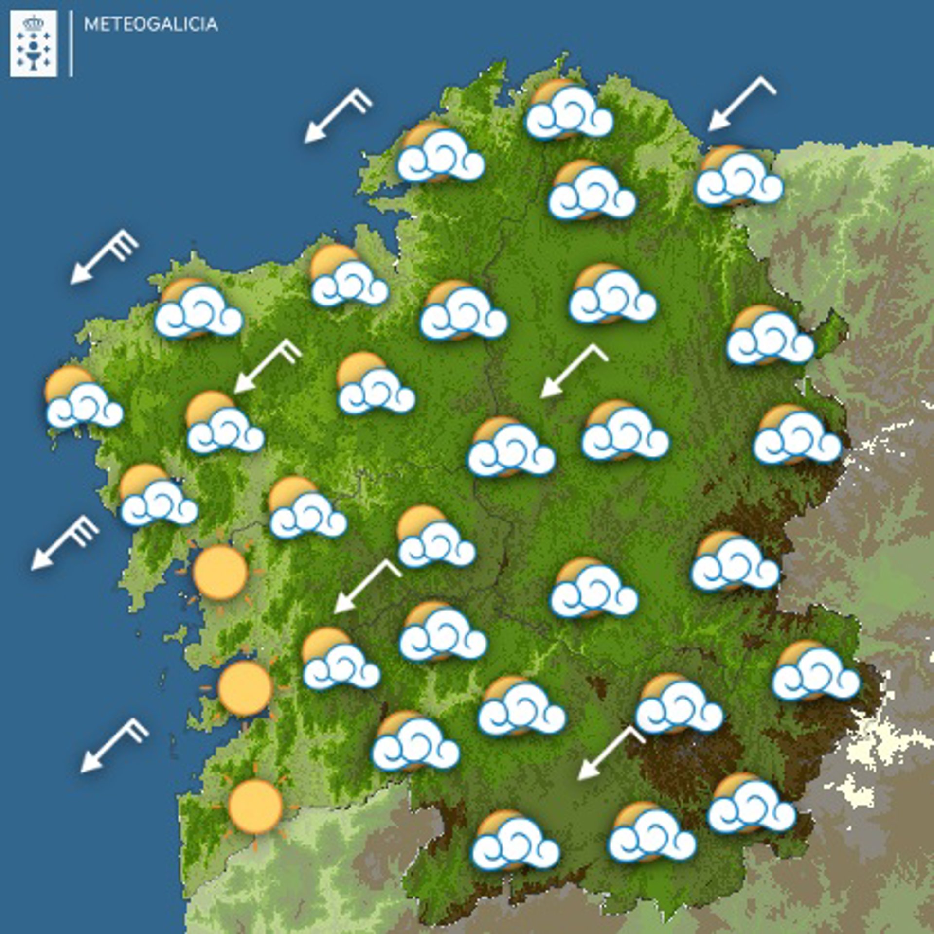 Las temperaturas mínimas sufrirán un ligero descenso, mientras que las máximas continuarán sin cambios o con ligeros ascensos en el oeste. Los vientos soplarán del nordeste, moderados en general, fuertes en la Costa da Morte.