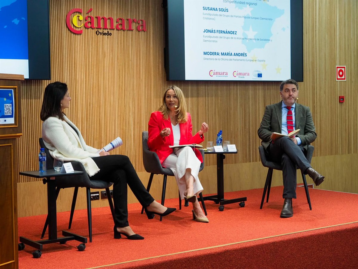 La Oficina del Parlamento Europeo en España ha organizado este viernes en la Cámara de Comercio de Oviedo una jornada sobre las oportunidades de la financiación europea en Asturias en la que han paticipado los eurodiputados asturianos, Susana Solís (PP) y Jonás Fernández (PSOE), y en la que se han referido al momento "crítico" que atraviesa Europa debido a la guerra arancelaria desatada por el presidente de EEUU, Donald Trump.