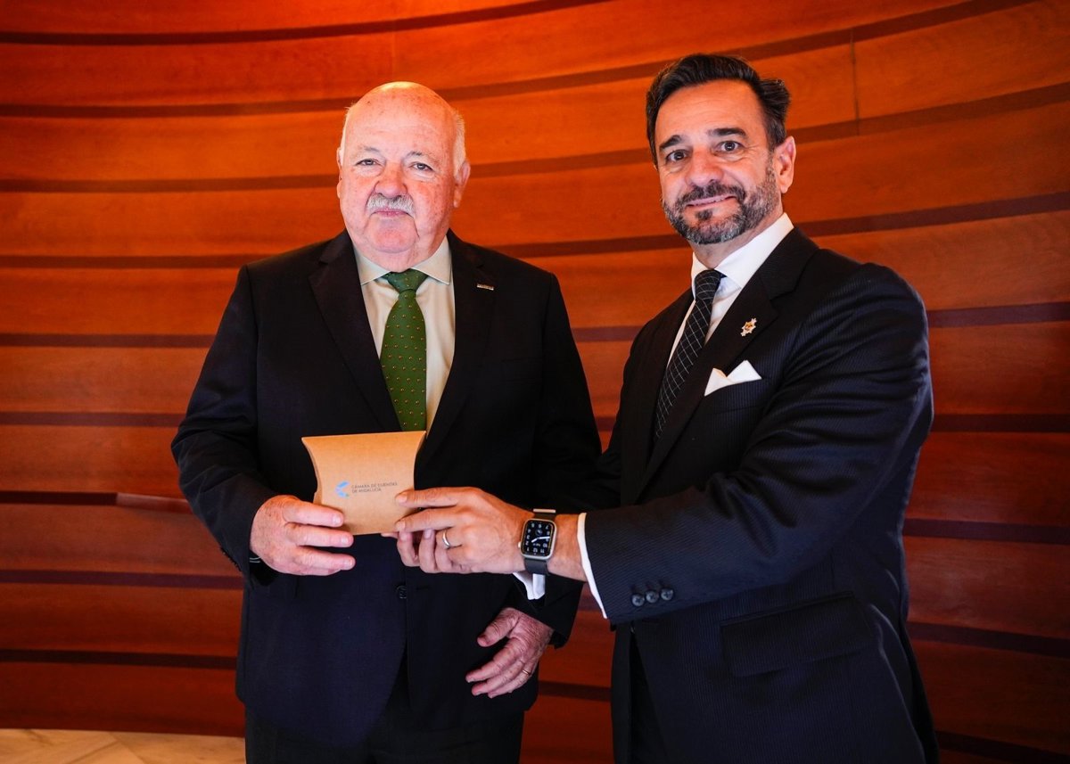 El presidente del Parlamento de Andalucía, Jesús Aguirre, y el presidente de la Cámara de Cuentas de Andalucía, Alejandro Cardenete, en la entrega este martes del informe de la Cuenta General de la Junta de Andalucía de 2023. - JOAQUÍN CORCHERO/PARLAMENTO DE ANDALUCÍA